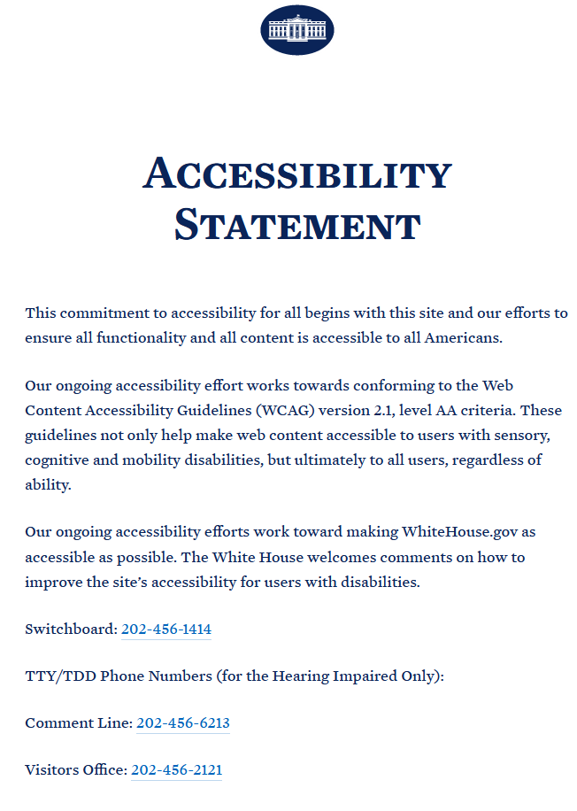 Within the day, Whitehouse.gov was lauded for a new accessibility statement on the site. The statement at least acknowledging the need for and actively working towards a more accessible website.